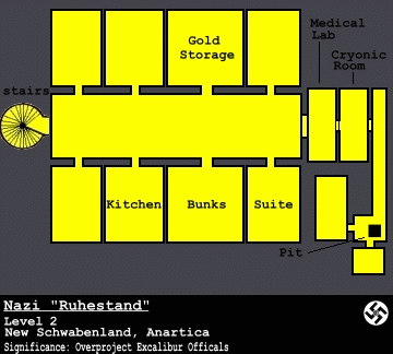 Deep in the Antarctic there is a redoubt. The actual gateway is located a small distance from the redoubt. It is actually the last Nazi stronghold from WW 2 and inside is hidden a kings ransom of stolen wealth that was never recovered after the war. One last Nazi survived here, along with a cloned Yeti.