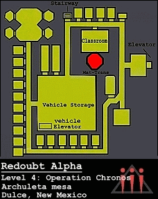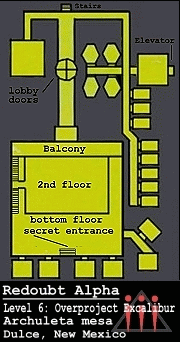 A redoubt is located in Dulce New Mexico. This redoubt houses the equipment and technology that allows the creation of the Hybrid race. It is where the outlanders that have been harvested for genetic material are sent by various harvesters like Milton Reeth had been. Here superior samples of humanity are kept in Cryonic suspension (Such as Kane's Father) to be used when needed. It is staffed by a large number of Hybrids. The redoubt is a six level affair (possibly seven levels). Each level of the redoubt is devoted to research in the various divisions of the Totality concept. Level four was devoted mainly to Project Cerberus. Level five was devoted to operation Chronos. Overproject Excalibur and it's sub-division occupied level six.